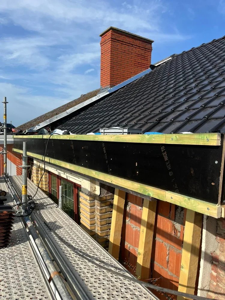 Daarna volgde de afwerking met de Stormpan 44 in antraciet, een stijlvolle en moderne dakpan die perfect aansluit bij de hedendaagse woonstijl. Ook de dakgoten werden volledig uitgewerkt en afgewerkt voor een strak geheel. Voor extra licht en comfort plaatsten we twee Velux-dakramen, en om alles mooi in detail af te ronden, kozen we voor witte Trespa afwerkingen.